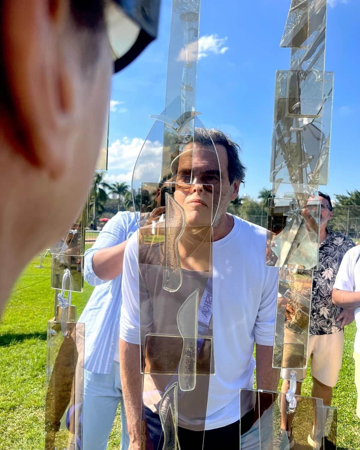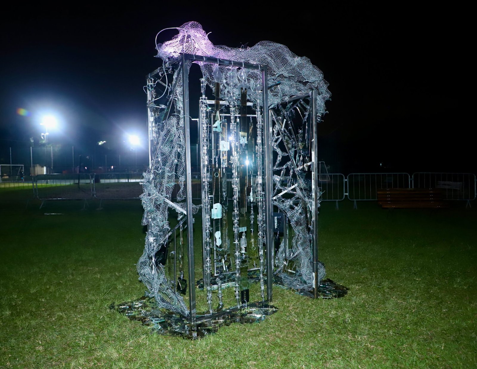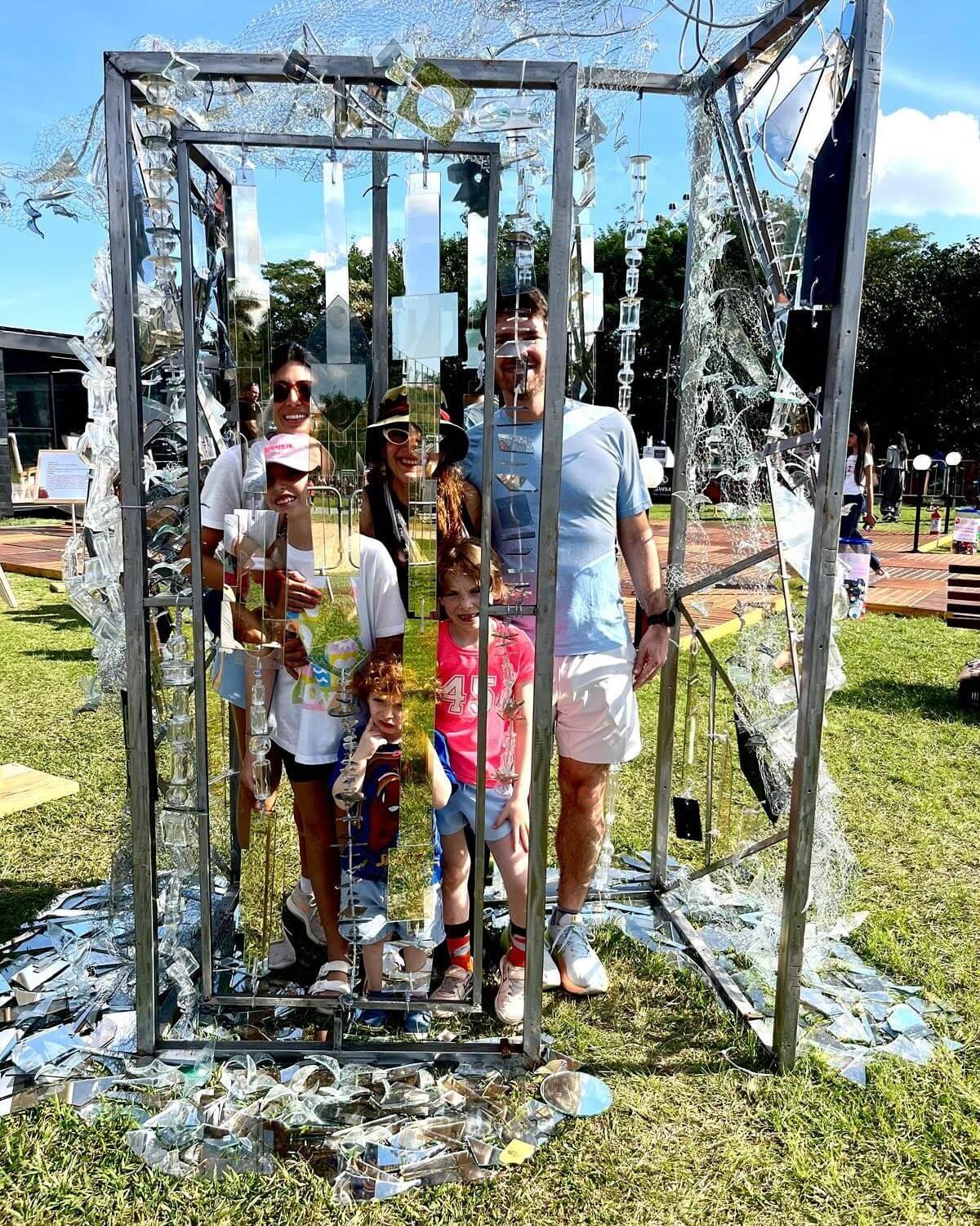 During the opening of the 2nd Bienal do Lixo, the artist presented the installation “Reflections of the Unspeakable”, composed of reflective glass surfaces that invite the audience to confront the theme of waste and excess through their own image. The work proposes a sensitive pause: to look at what we discard — and, above all, at the relationship we build with what we choose not to see.
